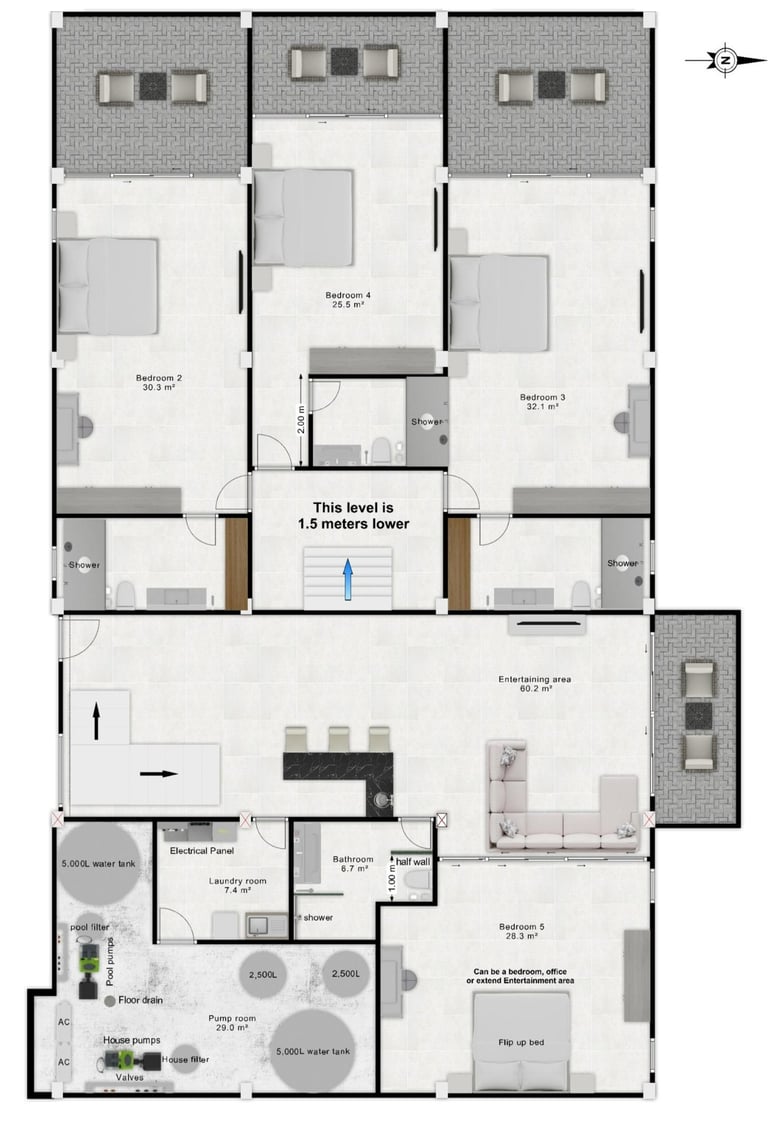 Layout: 5 bedrooms and 6 bathrooms, with the flexibility to convert the fifth bedroom into a large private office or extension of the lower entertainment area.